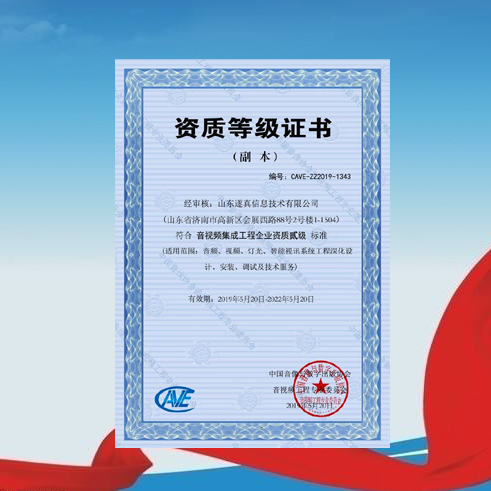 公司獲得中國(guó)音像協(xié)會(huì)音視頻工程專(zhuān)業(yè)委員會(huì)頒發(fā)的《音視頻集成工程企業(yè)資質(zhì)貳級(jí)》證書(shū),成為省內(nèi)首批通過(guò)該權(quán)威機(jī)構(gòu)認(rèn)證的二級(jí)資質(zhì)企業(yè)。